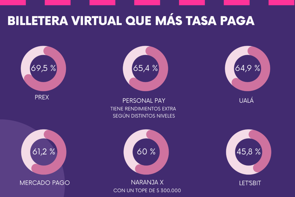 Por su parte, Let’sBit presenta una tasa del 45,83%, mientras que Personal Pay ofrece una tasa anual del 65,4% con posibles rendimientos adicionales según el nivel de consumo del usuario. Ualá ofrece un 64,94%, y Prex cierra la lista con un rendimiento del 69,5%.