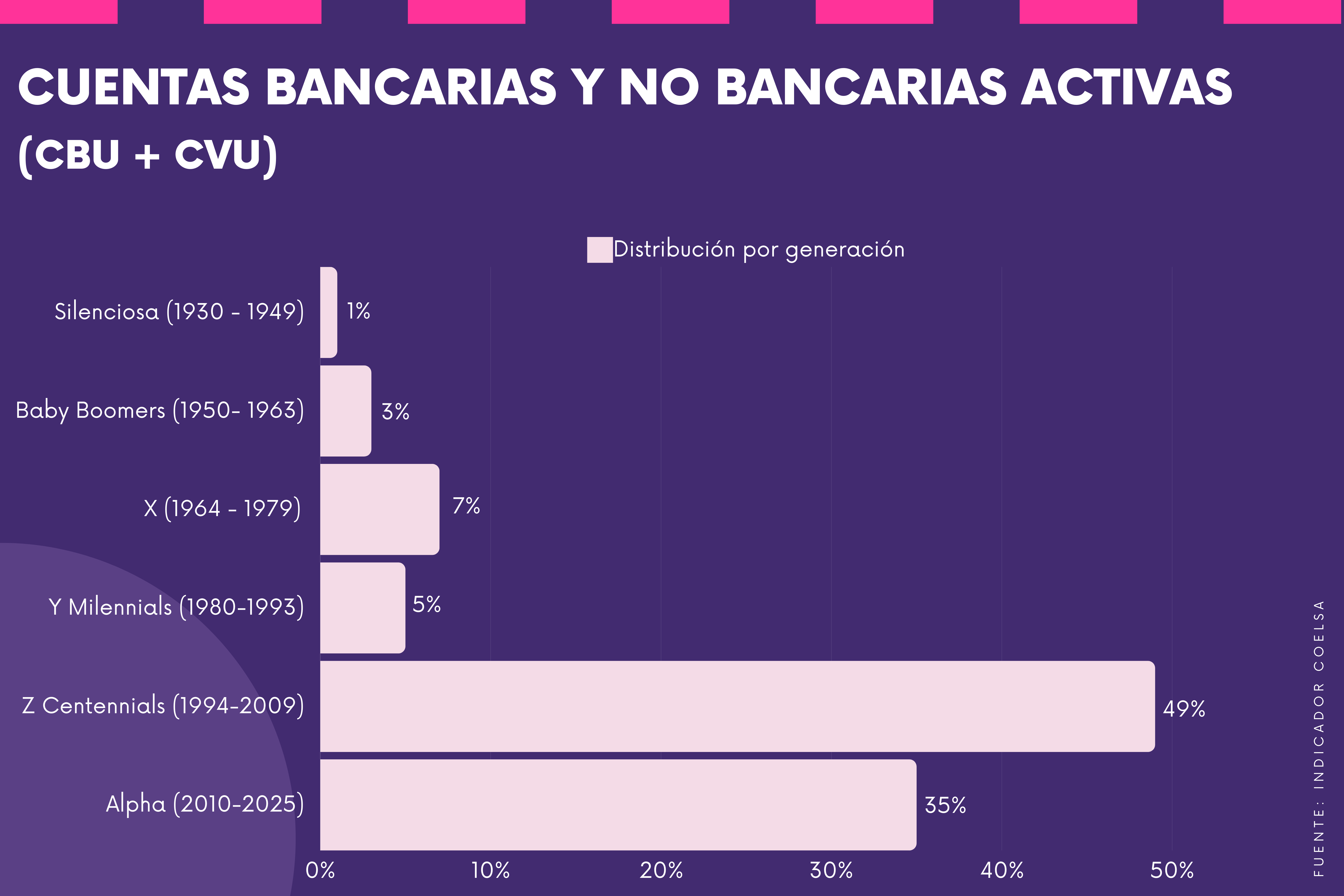 Respecto al resto de las nuevas cuentas, las mismas fueron abiertas por distintos grupos etarios: los millennials (nacidos entre 1980 y 1993) representan un 5% de las aperturas, la Generación X (1964 y 1979) un 7%, los baby boomers (1950 y 1963) un 3%, y solo un 1% corresponde a personas mayores de 75 años.