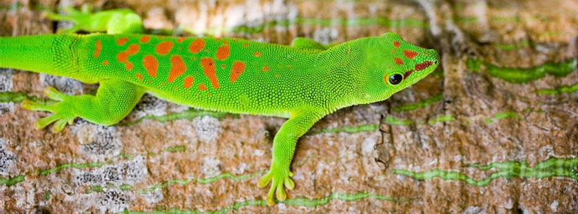 Comúnmente conocido como el gecko diurno gigante de Madagascar (Phelsuma madagascariensis), se encuentra en el Sistema de Áreas Protegidas de Madagascar.