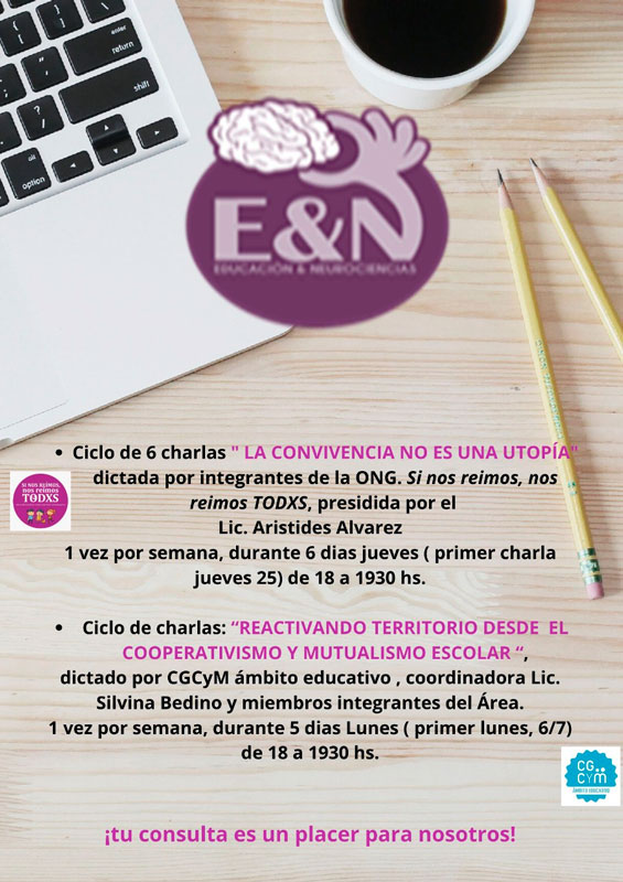 El área del CGCyM Ámbito Educativo fue invitado a formar parte de un ciclo de charlas que organiza E&N Educación y Neurociencias. En esta oportunidad el tema es Cooperativismo y Mutualismo Escolar y se desarrollará en 5 instancias mediante charlas virtuales a través de ZOOM. Participará de las mismas el equipo de profesionales integrantes de CGCyM Ámbito Educativo.