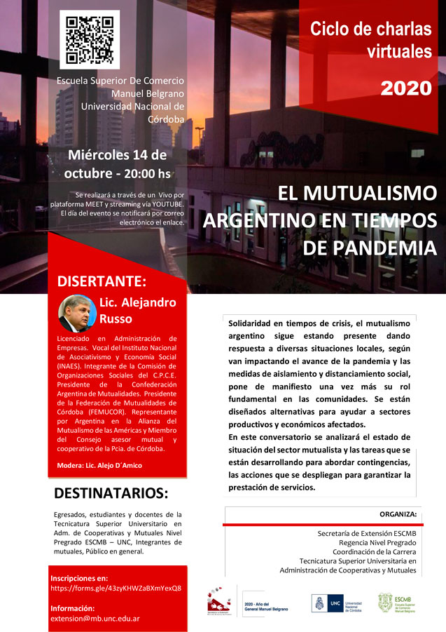 Alejandro Russo, director del INAES y presidente de la Confederación Argentina de Mutualidades (CAM) disertará en esta charla virtual organizada por la Secretaría de Extensión de la Escuela Superior de Comercio Manuel Belgrano (Universidad Nacional de Córdoba), Regencia Nivel Pregrado, Coordinación de la Carrera “Tecnicatura Superior Universitaria en Administración de Cooperativas y Mutuales”.