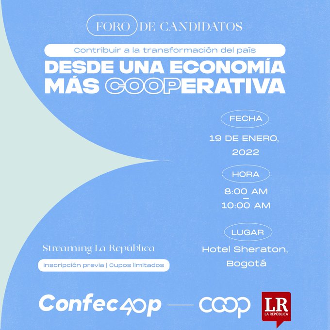 El día 19 de enero de 2022, de 8 am a 10:00 am en el Hotel Sheraton de Bogotá, se podrá escuchar a los candidatos presidenciales para conocer sus propuestas de fortalecimiento para el modelo cooperativo colombiano.