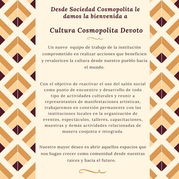 Durante la última semana de mayo fue formalmente presentada el área de la entidad Sociedad Cosmopolita, denominada “CULTURA COSMOPOLITA DEVOTO”, flamante proyecto sobre el que se empiezan a cimentar grandes expectativas.
