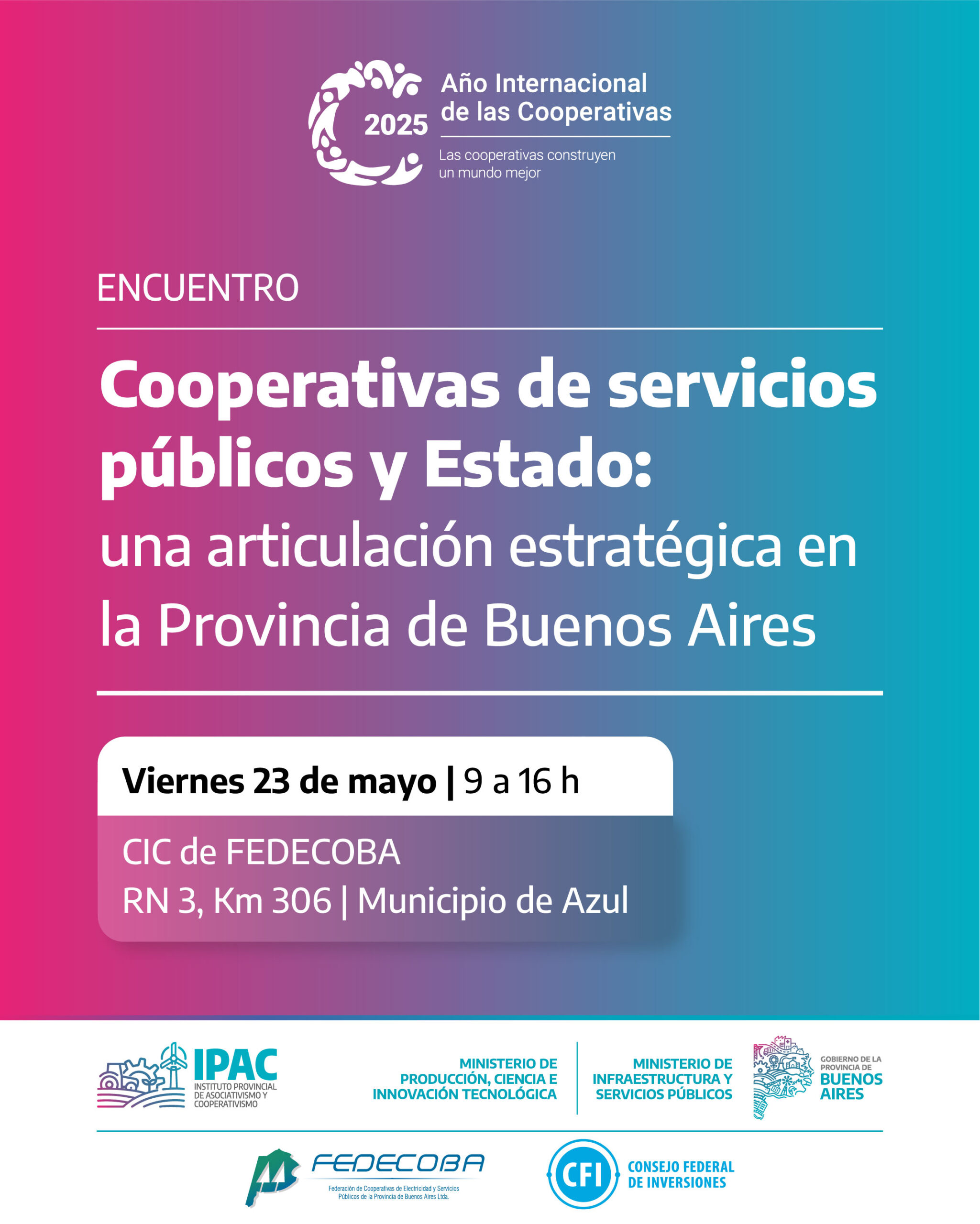 En el marco del Año Internacional de las Cooperativas, el Instituto Provincial de Asociativismo y Cooperativismo de la provincia de Buenos Aires (IPAC), el Ministerio de Infraestructura y Servicios Públicos de la Provincia, la Federación de Cooperativas de Electricidad y Servicios Públicos de la provincia de Buenos Aires (FEDECOBA) y el Consejo Federal de Inversiones (CFI), convocan a ser parte de esta jornada que tiene por objetivo principal poner en valor el rol que cumplen las cooperativas en la Provincia.