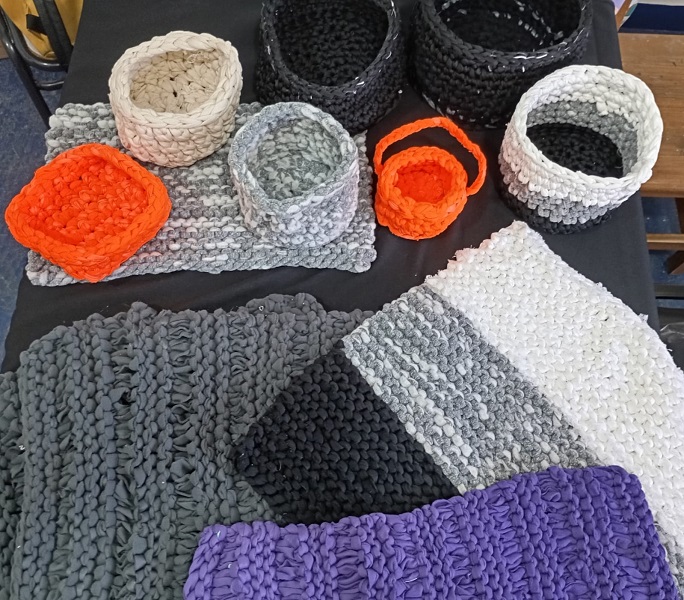 Luego del proceso realizado en la planta, donde se elegirán y reciclarán los residuos entregados por TEXCOM, la Fundación retirará los materiales para confeccionar los diversos artículos que comercializa para sostener todas sus actividades sociales y productivas. Entre éstos, produce alfombras para baños, canastas y guirnaldas.