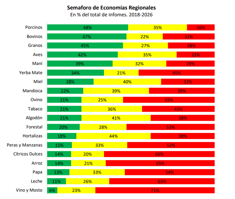 El semáforo de economías regionales se publica de manera mensual desde hace más de ocho años, lo que permite analizar el desempeño de las distintas actividades en una perspectiva de largo plazo. En este período, 8 de las 19 economías relevadas permanecieron en situación crítica (rojo) durante más de la mitad del tiempo. Entre los casos más comprometidos se destaca la vitivinicultura, que registró indicadores en rojo en más del 70% de los meses analizados. Le siguen la actividad citrícola (66%), el arroz (65%) y la lechería (63%).