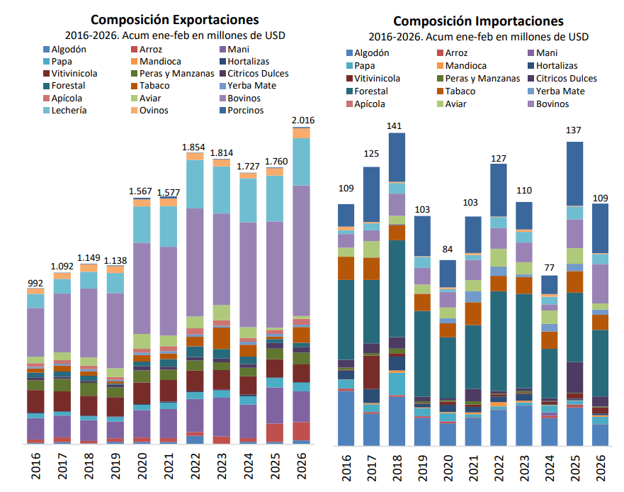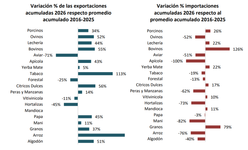Por el contrario, algunas actividades registraron fuertes caídas en sus importaciones. El maní redujo sus compras externas de un promedio de USD 200 mil a USD 36 mil (-82%), mientras que el arroz pasó de USD 710 mil a USD 170 mil (-76%) y las hortalizas mostraron una caída del 73%. A pesar de la magnitud de estas variaciones en términos porcentuales, en valores absolutos se trata de montos reducidos: en conjunto, las importaciones de estos sectores representan menos del 1% del total importado en el primer bimestre.