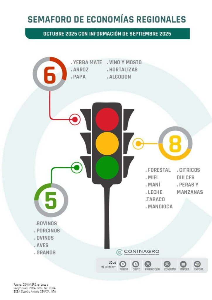 Durante septiembre de 2025, el Semáforo de Economías Regionales registró 5 actividades en verde, 8 en amarillo y 6 en rojo. En comparación con el mes anterior se observaron desmejoras, ya que dos actividades cambiaron de categoría, destacándose los casos de algodón y peras y manzanas, que mostraron retrocesos. En particular, el algodón pasó de amarillo a rojo, mientras que peras y manzanas descendieron de verde a amarillo.