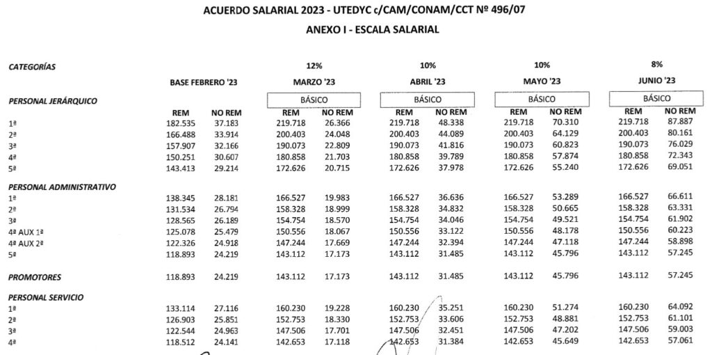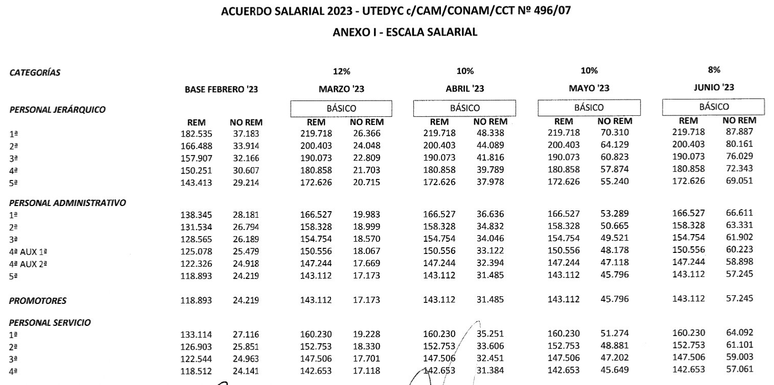 Las Confederaciones de Mutuales (CAM y CONAM) firmaron un acta acuerdo con la representación gremial UTEDyC, con un incremento salarial para los trabajadores regidos por el CCT nº 496-07; el mismo establece un incremento salarial del 40 % para este semestre, calculado sobre los salarios básicos vigentes a febrero 2023, que se abona en cuatro tramos: