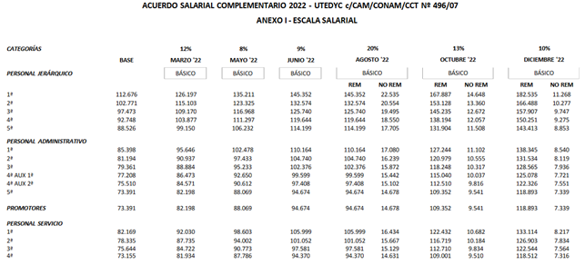 Este incremento se plasmará en una nueva escala salarial con los básicos correspondientes que será de aplicación inmediata y de obligatorio cumplimiento para las partes, quienes además se comprometen a realizar las presentaciones necesarias al Ministerio de Trabajo Empleo y Seguridad Social de la Nación como parte integrante del Acuerdo salarial paritario del CCT 496/07 para el año 2022”.