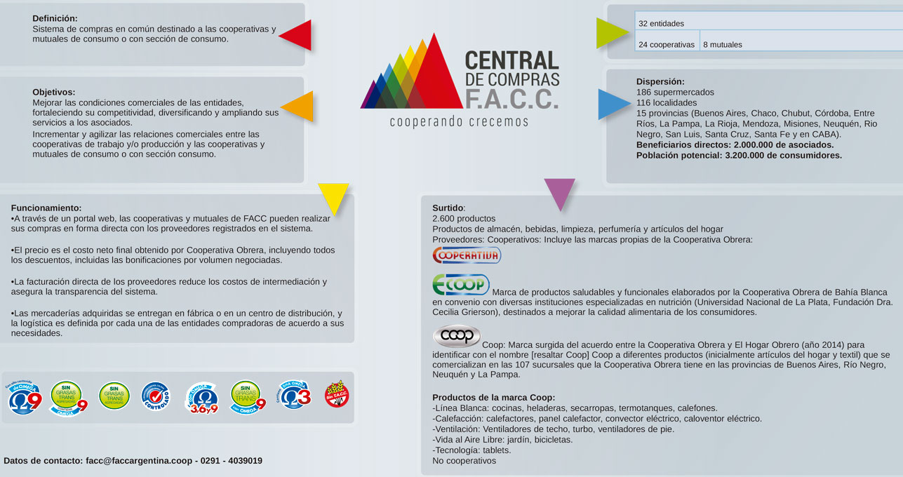 La Central de Compras de la FACC (CCFACC) propone un sistema abierto y tecnificado que facilita el intercambio de bienes entre entidades de la Economía Social y Solidaria. Si hay algo característico en el sector cooperativo y mutual es su capacidad para resolver problemáticas comunes poniendo en juego la inteligencia asociativa. Este es el caso de la CCFACC, una plataforma de interacción económica que permite a las secciones de consumo de las entidades distribuir productos a mejor precio en beneficio de los consumidores.
