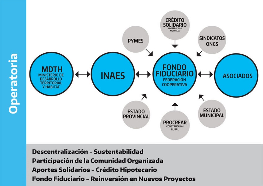 De acuerdo con la propuesta de la economía solidaria, cooperativas de vivienda, de trabajo, de servicios públicos, de crédito y otras podrán llevar adelante junto con las mutuales distintos proyectos habitacionales, tanto en zonas urbanas como rurales.