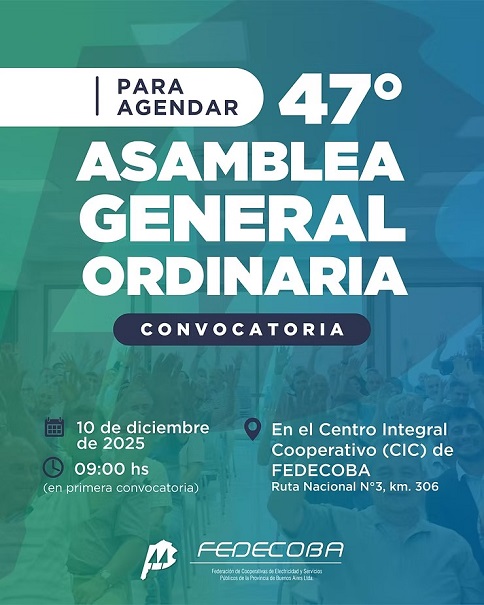 La 47° Asamblea General Ordinaria de FEDECOBA ya tiene fecha. Se realizará el miércoles 10 de diciembre a las 9:00 horas, en primera convocatoria, en el Centro Integral Cooperativo (CIC) ubicado en Azul.