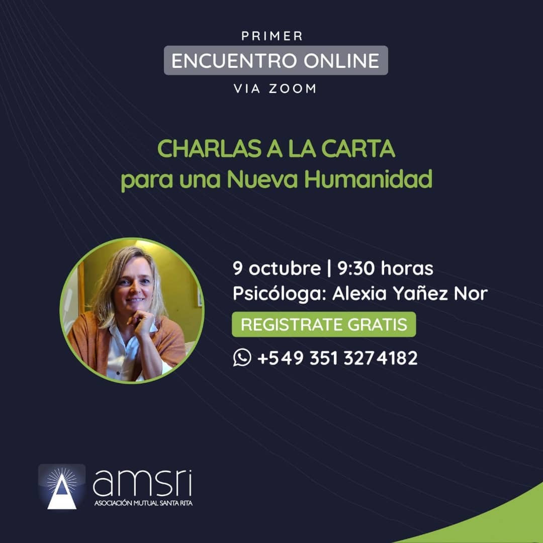El sábado 9 de octubre, la Asociación Mutual Santa Rita (AMSRI) inició el desarrollo del ciclo “Charlas a la carta para una Nueva Humanidad“, un espacio de encuentro destinado a brindar información multidisciplinaria sobre la condición humana coordinado por la Lic. Alexia Yañez Nor.