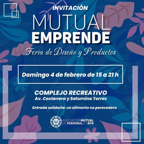 Este domingo 04 de febrero se realizará la primera Feria de Diseño y Productos “MUTUAL EMPRENDE”, una iniciativa para dar a conocer las propuestas de las asociadas y asociados emprendedores.