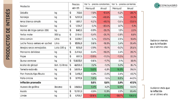 El impacto se observa con mayor intensidad en productos como la yerba mate, donde los costos han aumentado por encima de los precios, afectando la rentabilidad de los productores. Esta situación se replica en varias economías regionales que abastecen el mercado interno. Por poner algunos ejemplos: en el último año la cebolla ha perdido el 51,6% de su valor real, la naranja el 48,5%, el arroz el 48,1%, el azúcar el 35,6% y la harina el 30,1%.