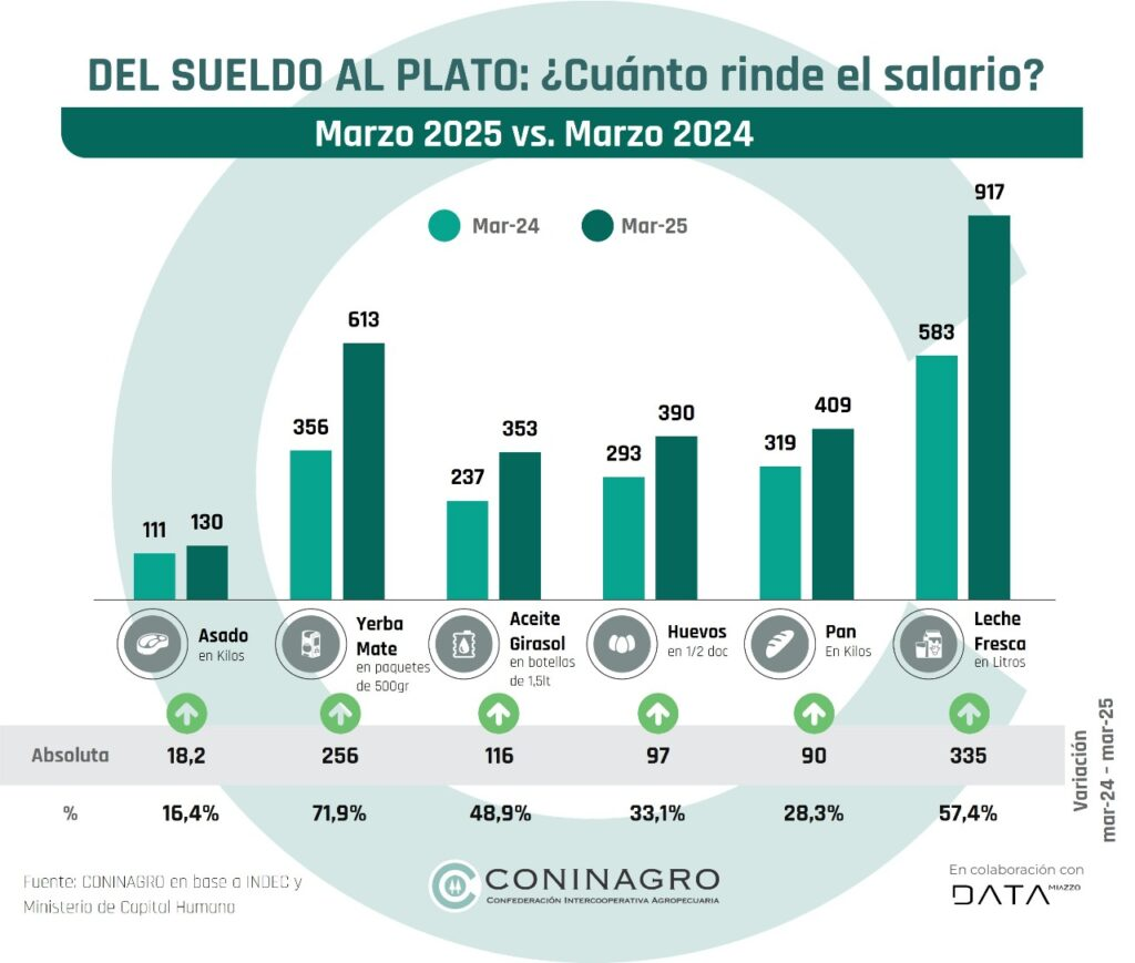 Entre marzo de 2024 y marzo de 2025, el poder de compra mostró una mejora significativa frente a productos esenciales de la canasta básica: aceite de girasol, yerba mate, leche, asado, huevo y pan.