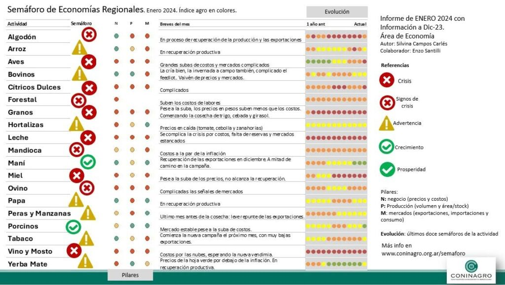 Coninagro publica esta herramienta para que los productores agropecuarios puedan hacer un seguimiento de los indicadores que se analizan. He aquí el relevamiento de las 19 economías regionales monitoreadas por el área de Economía de CONINAGRO, con cifras que surgen del análisis realizado durante el mes de enero de 2024.