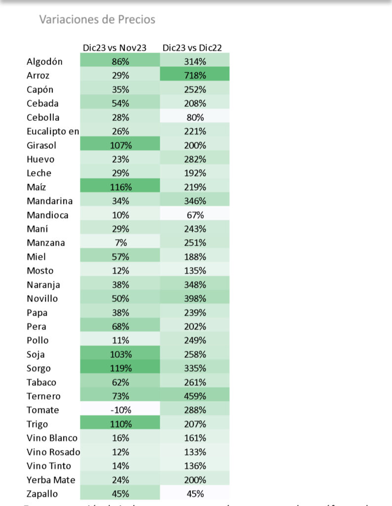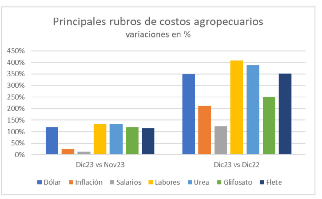 La contracara de los precios, los costos promedios de las 19 actividades crecieron interanualmente +250% en diciembre de 2023, con un máximo de +334% en el caso de arroz con pozos de gasoil (zona Entre Ríos). Las variaciones mensuales e interanuales de los principales rubros se muestran en el siguiente cuadro: