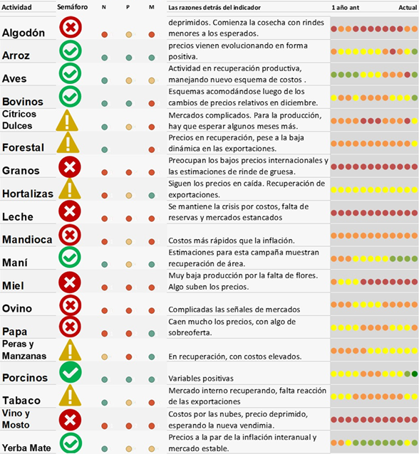 N=1 si p>0 y c>0; N=0 si p<0 y c>0 o si p<0 y c<0 y N=-1 si p<0 y c<0 donde p= es la Variación interanual de Precios al Productor -Variación interanual del IPC (Indice de Precios al Consumidor) c = (Variación interanual de Precios al Productor)-(Variación interanual del Índice de Costos al Productor) Es decir, N refleja la situación microeconómica, una aproximación al margen bruto, los precios al productor se comparan contra la inflación, para medir poder adquisitivo y la variación de los costos se comparan con la del precio del producto, como aproximación a la rentabilidad. Estos valores se miden en pesos argentinos. P=1 si s>0 y t>0; P=0 si s<0 y t>0 o si s<0 y t<0 y P=-1 si s<0 y t<0 s= Variación interanual de la superficie o stock (dato nacional) t= es la Variación Interanual de la producción física (en volumen). Las actividades de base agrícola se miden en toneladas anuales estimadas al mes de referencia, mientras que en la ganadería se mide faena en toneladas mensuales. Es decir, P refleja la situación productiva, una aproximación al volumen físico, tanto de la base productiva (la superficie sembrada o las cabezas), como del producto en sí. M=1 si e>0 y/o c>o, con i<0 ; M=0 si e<0 y/o c>0 o si e>0 y/o c<0 y M=-1 si e<0 y/o c1 verde