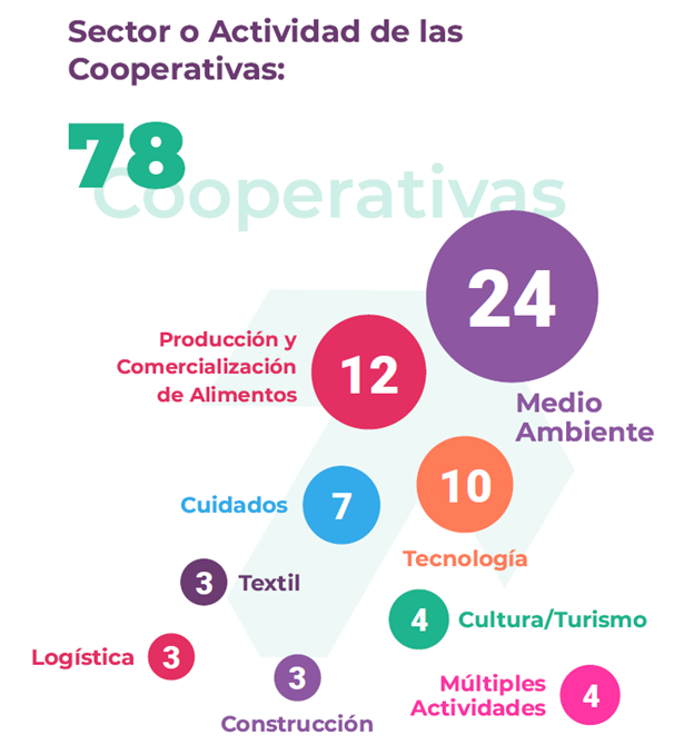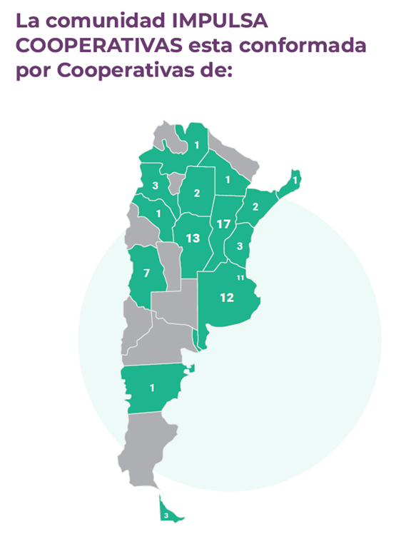 La comunidad de Impulsa Cooperativas está compuesta por 78 entidades de trabajo de diversas actividades, distribuidas en 14 provincias, más Capital Federal. Estas cooperativas abarcan sectores como medio ambiente, producción y comercialización de alimentos, tecnología, cuidados, cultura/turismo, entre otros.