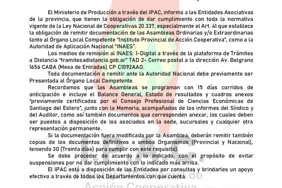 El Ministerio de Producción de la Provincia, a través del Instituto Provincial de Acción Cooperativa (IPAC), ha anunciado modificaciones en la constitución de cooperativas en la región. Según lo comunicado por el IPAC, las Entidades Asociativas de la provincia tienen la obligación de cumplir con la normativa vigente de la Ley Nacional de Cooperativas 20.337, especialmente el Artículo 41, que establece la obligación de remitir documentación de las Asambleas Ordinarias y/o Extraordinarias tanto al Órgano Local Competente, es decir, el Instituto Provincial de Acción Cooperativa, como a la Autoridad de Aplicación Nacional, el INAES.
