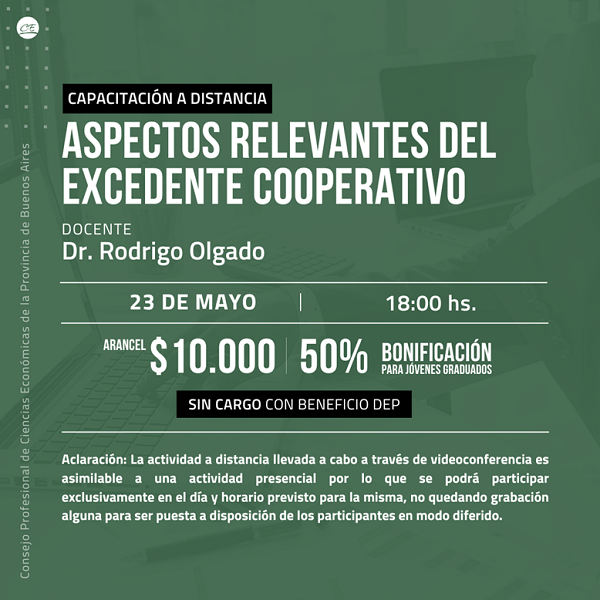 CAPACITACIÓN VIRTUAL: CURSO Aspectos relevantes del excedente cooperativo 2025 – CLASE 23 DE MAYO de 18 hrs a 21 hrs .