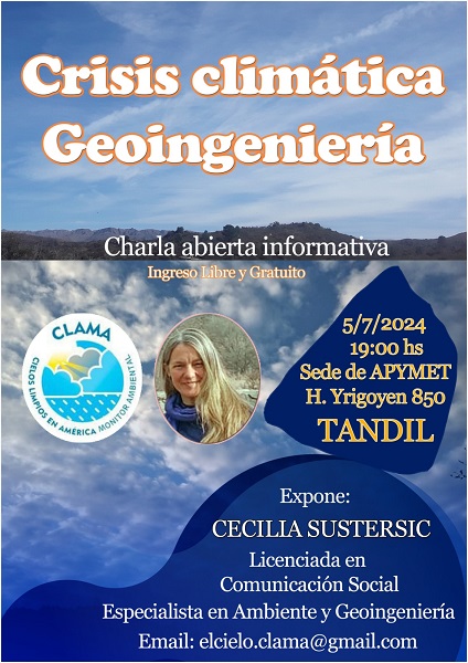 El Grupo Tandil Cielos Limpios invita a la charla abierta y gratuita “Cambio Climático e Ingeniería del Clima” que brindará la Licenciada en Comunicación Social y docente Cecilia Sustersic, integrante de la organización CLAMA, Cielos Limpios en América Monitor Ambiental.