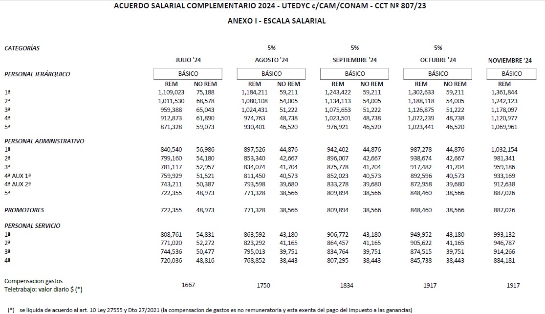 Se suscribió entre la CAM/CONAM y Utedyc un acta acuerdo de recomposición salarial para el trimestre agosto-septiembre-octubre 2024, del 15%, con base julio 2024, cuya copia les adjuntamos, junto al anexo que contiene la escala salarial, para el citado período; el mismo establece las siguientes consideraciones: