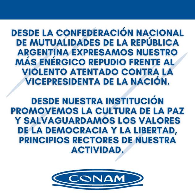 Desde la Confederación Argentina de Mutualidades (CAM) nos solidarizamos con Cristina Fernández de Kirchner, Vicepresidenta de la Nación Argentina, tras el atentado sufrido contra su persona y adherimos al feriado nacional decretado desde el Ejecutivo Nacional a los fines de que haya una expresión unánime en defensa de la paz y la democracia.